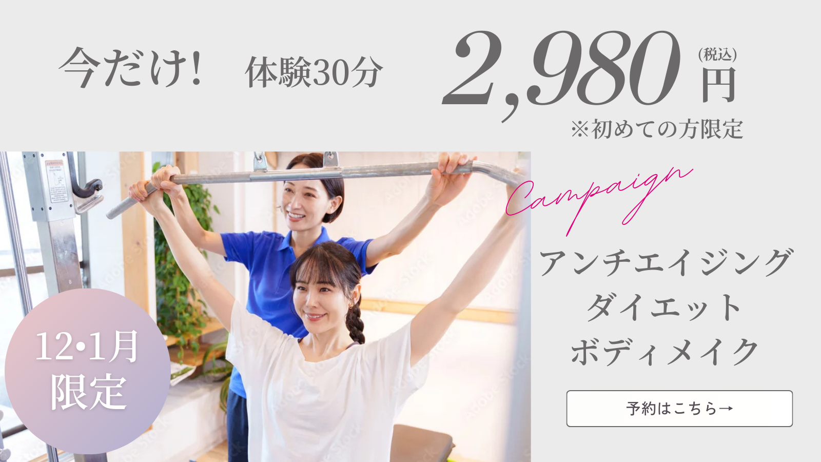 | トレーニング30分を8回受ける事が出来ます ご自身のペースで予約可能です | 整体30分とトレーニング30分のコースを8回受ける事が出来ます |